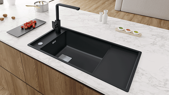 profinjena i odlučna. Duboka crna, poboljšana matiranom formulom i glatkom neporoznom površinom. Black Matt, crna mat boja koja priziva čistoću i daje elegantan dizajn bilo kojem okruženju. Živopisnog tonaliteta apsolutno sposobna poboljšati profinjeni Franke dizajn. Preljevnik, daljinski upravljač, poklopac odvoda sada su također dostupni u crnoj boji kako bi se slagali s našim Black Matt sudoperima i slavinama te tvorili jedinicu homogene boje.