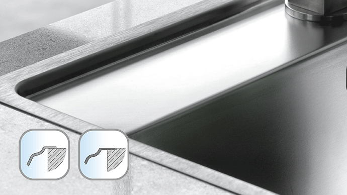 Klasično rješenje. Kod standardne ugradnje rub je izbočen, te daje sudoperu dodatnu stabilnost. Sudoper je fiksiran u otvoru radne ploče, koja može biti izrađena od bilo kojeg materijala. Rub standard je debljine 6mm.