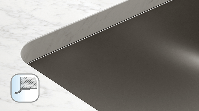 Mythos za ugradnju ima bešavni rub od 6 mm koji se savršeno uklapa u radnu površinu. U svakom slučaju, sigurno će dodati nešto prekrasno svakoj kuhinji. Poklopac leži u ravnini s otpadom i elegantno se uklapa u sudoper, što ga čini mnogo lakšim za čišćenje. Sve